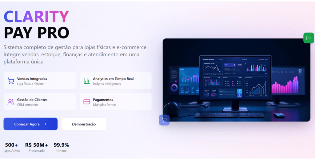 Na Clarity Pay, transformamos ideias em soluções eficientes, personalizando software e chatbots para atender às necessidades reais de empresas e autônomos. Usamos a tecnologia a a favor do crescimento e fortalecimento de negócios, com um escala surpreendente utilizando as ferramentas adequadas a cada situação.